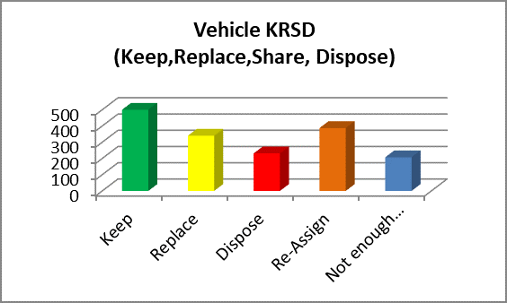 Provides a numerical evaluation of the vehicle and projects a recommended action (Keep, Replace, Share, Dispose) to consider for each vehicle.
